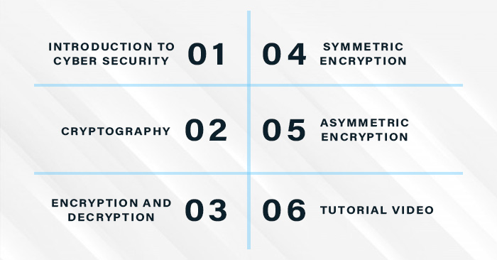 အခုရှင်းပြမယ့် blog ကိုတော့ ညီမအနေနဲ့ အထက်ပါပုံက‌ခေါင်းစဉ်များနှင့် ရှင်းပြချင်ပါတယ်ရှင်။ ပထမခေါင်းစဉ်ကတော့ Cyber Security အကြောင်းရှင်းပြထားတဲ့ Introduction နှင့် လုံခြုံရေးထားရှိရသည့် ရည်ရွယ်ချက်များဖြစ်ပြီး၊ ဒုတိယခေါင်းစဉ်ကတော့ Cyber Security အတွက်အ‌ရေးပါတဲ့ Cryptography အကြောင်း၊ တတိယခေါင်းစဉ်အနေနဲ့ကတော့ Cryptography နည်းပညာများထဲမှ တစ်ခုဖြစ်တဲ့ Encryption နဲ့ Decryption အကြောင်းများအပြင်၊ နံပါတ်(၄)ခေါင်းစဉ်ကတော့ အချိုးကျစာဝှက်စနစ် (Symmetric Encryption) အကြောင်းနှင့် အချိုးမညီစာဝှက်စနစ် (Asymmetric Encryption) အကြောင်းတို့ဖြစ်ပြီး နောက်ဆုံးခေါင်းစဉ်ကတော့ အပေါ်ကရှင်းပြသွားတဲ့ အကြောင်းအရာတွေကို ပိုနားလည်လွယ်အောင် practical ကျကျရှင်းပြထားတဲ့ YouTube Tutorial video တို့ပဲ ဖြစ်ပါတယ်ရှင်။