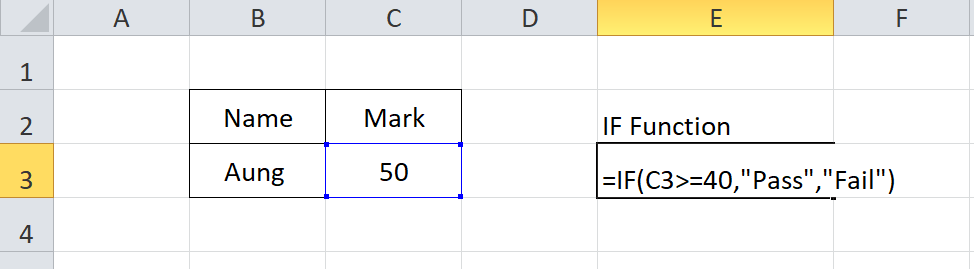 ပိုမိုမြင်သာအောင်ပြောပြရမယ်ဆိုရင် ကျောင်းတစ်ကျောင်း၏ စာမေးပွဲရမှတ်စာရင်းတွေကို ကြည့်ရအောင်နော်။ ပုံသေနည်းမှာ C3>=40 ကတော့ ကျောင်းသားတစ်ယောက်ရဲ့ရမှတ်က 40နှင့်ညီမယ်၊ကြီးမယ်ဆိုရင် Pass ဖြစ်ပြီးတော့ မဟုတ်ရင်တော့ Fail ဖြစ်မယ်အခြေအနေပါ။ ဒီလောက်ဆိုရင်တော့ နားလည်သွားပြီလို့ ထင်ပါတယ်။