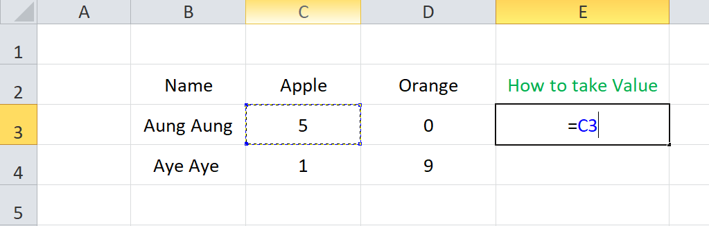 C ဆိုတာကတော့ Column နာမည်ကိုပြောတာပါ။ 3 ကတော့ Row နာမည်ကို ပြောပြတာပါ။ Column နှင့် Row ပေါင်းလိုက်ရင် ဆဲလ်(Cell) ကွက်လေးဖြစ်သွားပါတယ်။ ဆဲလ်ကွက်လေးထဲက ရှိနေသော တန်ဖိုးကို ယူချင်ရင်တော့ အပေါ်က ပုံသေနည်းလေးကဲ့သို့ မိမိယူချင်သော Column နာမည်ယူမယ် ပြီးရင် Row နာမည် ယူပါမယ်။ ညီမျှခြင်း (=) လေးကိုတော့ အရင်ရေးဖို့ မမေ့ပါနဲ့နော်။ Cell အကွက် C3 ကို မရေးချင်ရင်လည်း ညီမျှခြင်း ( = ) ရေးပြီးတာနဲ့  မိမိလိုချင်သော Cell အကွက် ( C3 ) မှာ Mouse ဖြင့် Click လုပ်ရင်လည်း ရပါတယ်။