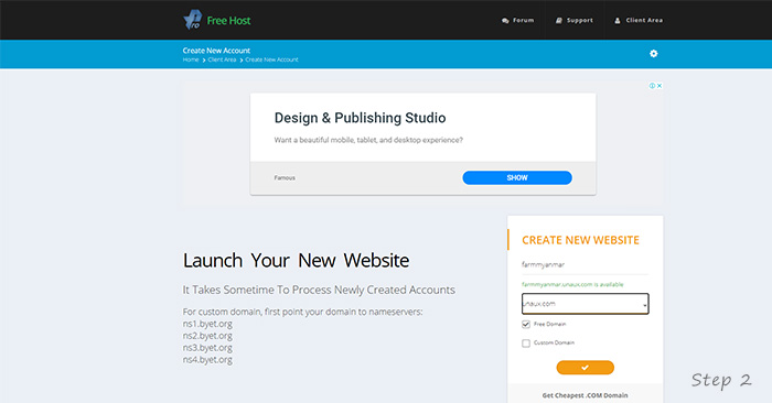 ၂။ ပုံမှာပြထားတဲ့ အတိုင်း ကိုယ်ရေးချင်တဲ့ website name တစ်ခုကို create လုပ်ပါမယ်။ ဥပမာ farmmyanmar ဆိုပါစို့။ domain free ကိုသုံးမှာဖြစ်တဲ့ အတွက် option နှစ်ခုထဲက ကိုယ်ကြိုက်နှစ်သက်ရာကို ရွေးလို့ရပါတယ်။ ကျွန်မကတော့ unaux.com ကိုရွေးလိုက်ပါ့မယ်။