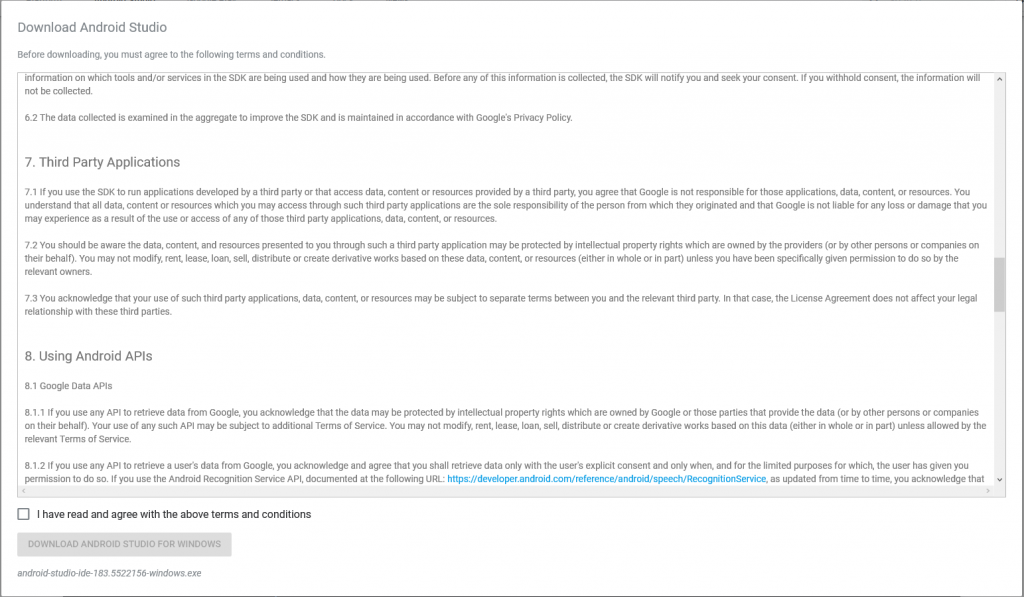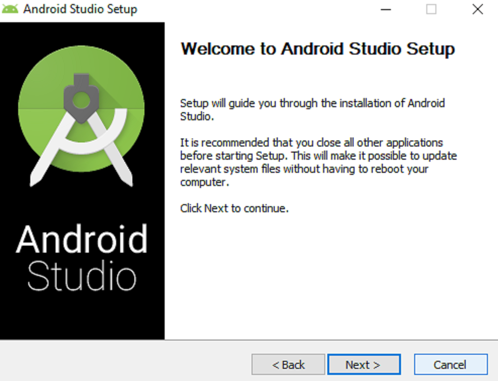 ထိုအခါ မိမိ က “I have read and agree with the above terms and conditions” ကို check လုပ်ပြီး “Download android studio for windows” ကို နှိပ်လိုက်ပါ။ .exe file ရလာပါမည်။ ထို့နောက် Android Studioကို စတင် Set Up လုပ်ဖို့အတွက် .exe fileကို Run ရင်အောက်က Figure (2) အတိုင်းစတင်မြင်တွေ့ရမှာ ဖြစ်ပါတယ်။
