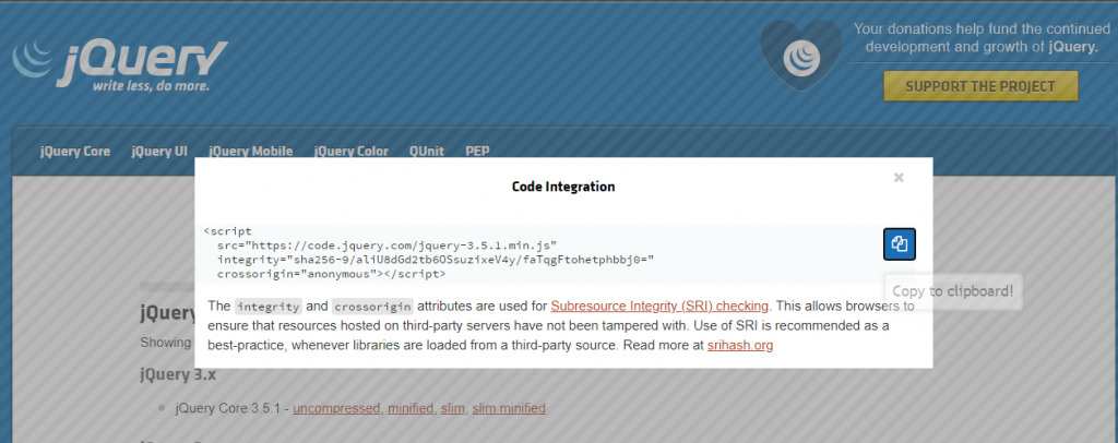 CDN ကို ချိတ်သုံးဖို့အတွက် ဒီ link ကို https://code.jquery.com/ ဝင်ပြီး minified ကို နှိပ်လိုက်ပါ။ Pop Up Box ပေါ်လာရင် Copy Icon ကို နှိပ်၍ Copy ကူးပါ။