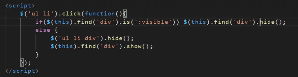 - <script> အဖွင့် အောက်ကနေ စပြောပါမယ်။ ပထမ လိုင်းကတော့ ul li ကို နှိပ်ရင်လို့ ပြောတာပါ။ အပေါ်မှာ ရှင်းပြပြီးခဲ့တဲ့အတိုင်း ဒုတိယလိုုင်းကတော့ if Condition ထည့်ထားတာပါ။ အကယ်၍ နှိပ်လိုက်တဲ့ Drop-Down Menu ( ul ထဲက li ထဲက div ) က .is(‘:visible’) ဆိုတာက Screen မှာ ပေါ်နေမယ်ဆိုရင် ၎င်းကို ဖျောက်ပေးပါလို့ ပြောတာပါ။