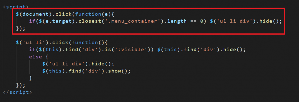 အနီအကွက်ထဲက ကုဒ်လိုင်း အသစ်ကို ထည့်ပါမယ်။ ၎င်းကုဒ်က ဘယ်လို အလုပ်လုပ်လဲဆိုရင် document ကို click နှိပ်ရင် ဆိုပြီး ရေးထားတာပါ။ function(e) ဆိုတဲ့ အထဲက e ဆိုတာ event ကို ပြောတာပါ။ နောက်တစ်လိုင်းကတော့ document ထဲက ဘယ်နေရာကိုနှိပ်နှိပ် function က အလုပ်လုပ်နေမှာပါ။ အဲ့အတွက် if Condition တစ်ခု ခံထားပါတယ်။ e.target ဆိုတာ ကိုယ်နှိပ်လိုက်တဲ့ element ကို ပြောတာပါ။ .closest ဆိုတာ နှိပ်လိုက်တဲ့နေရာရဲ့ parent တွေမှာ .menu_container class name ပါတဲ့ element ရှိလားလို့ condition စစ်ထားတာပါ။ .length == 0 ဆိုတာ တစ်ခုမှ မရှိခဲ့ရင် ul li div ဆိုတာ Drop-Down Menu အားလုံးကို ဖျောက်မယ်လို့ ပြောတာပါ။ အဲ့အတွက် user က menu နေရာကလွဲလို့ အခြားနေရာ ဘယ်နေရာနှိပ်နှိပ် Drop-Down Menu ကို ဖျောက်မယ်လို့ ပြောတာပါ။