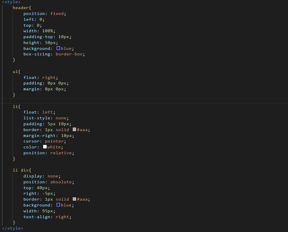 အခုဆိုရင်တော့ ကိုယ်လိုချင်တဲ့ Drop-Down Menu လေးက ပြီးပြည်စုံတဲ့ ကုဒ်လေး ရရှိပြီ ဖြစ်ပါတယ်။ အဲ့ကုဒ်မှာဆိုရင် .hide(), .show() နေရာမှာ class နဲ့ display: none; တို့ display:block; တို့နဲ့ ကစားလို့ ရပါတယ်။