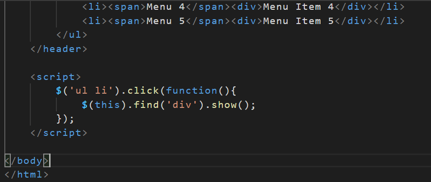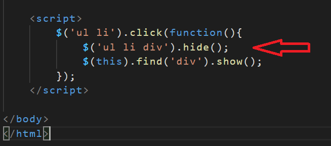 JavaScript စတင် ရေးပါမယ်။ ရေးတဲ့အခါ အပေါ် HTML Tags တွေရဲ့ အောက်မှာ ရေးပါမယ်။ ကုဒ်မှာ ကြည့်မယ်ဆိုရင် ul ထဲက li ကို .click ဆိုတာ click နှိပ်ရင် this ဆိုတာ ၎င်းနှိပ်လိုက်တဲ့ အထဲက div ကို .show() ဆိုတာ ပြမယ်လို့ ခိုင်းလိုက်တာပါ။ အဲ့ဒီမှာ ul li အစား class name နဲ့လည်း ထည့်သုံးလို့ ရပါတယ်။ အခုက Tag နာမည်နဲ့ပဲ သတ်မှတ်ထားပါတယ်။